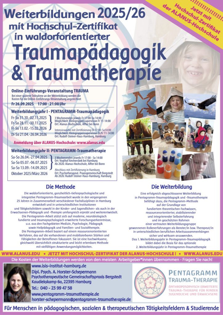 Ab Herbst 2025 fachliche Leitung der hochschulzertifizierten Postgraduierten-Weiterbildungsgänge in Pentagramm-Traumapädagogik und Pentagramm-Traumatherapie an der Alanus-Hochschule in Alfter bei Bonn (zur Zeit in Planung)