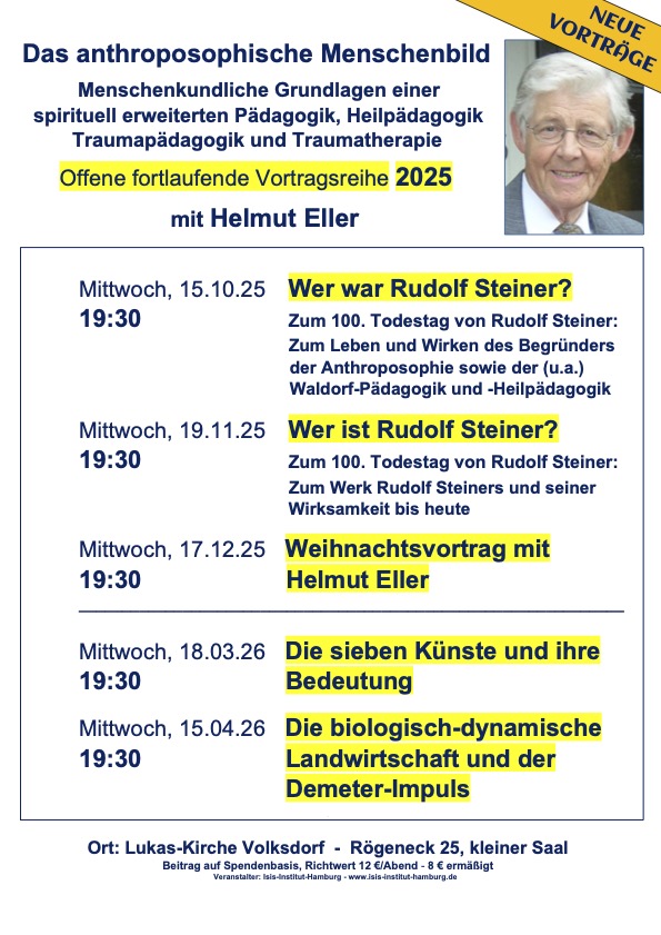 Dozent für die menschenkundlichen Grundlagen-Vorträge des Isis-Institutes im Fachbereich Anthroposophische Menschenkunde, die jeweils am 3. Mittwoch eines Monats ab November 2022 in der Lukas-Kirche Volksdorf unter dem Titel: