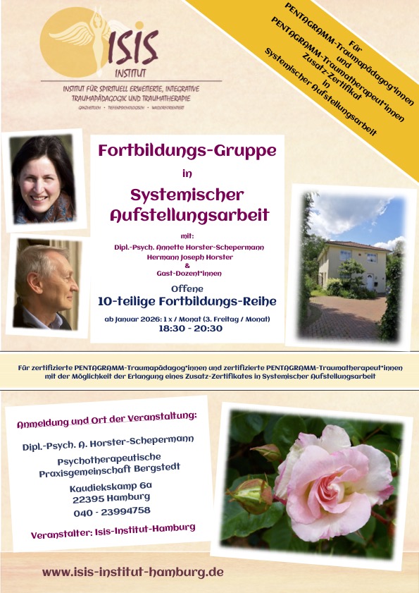 Mit wohlwollender kollegialer Unterstützung durch freundschaftlich verbundene ärztliche und psychotherapeutische Kolleg*innen Entwicklung, Konzeptualisierung und seit 2021 auch Durchführung eines 1- bzw. 2-jährigen Curriculums für die Weiterbildung in waldorforientierter Traumapädagogik bzw. waldorforientierter Traumatherapie (Pentagramm-Traumapädagogik und Pentagramm-Traumatherapie) am Isis-Insitut-Hamburg.